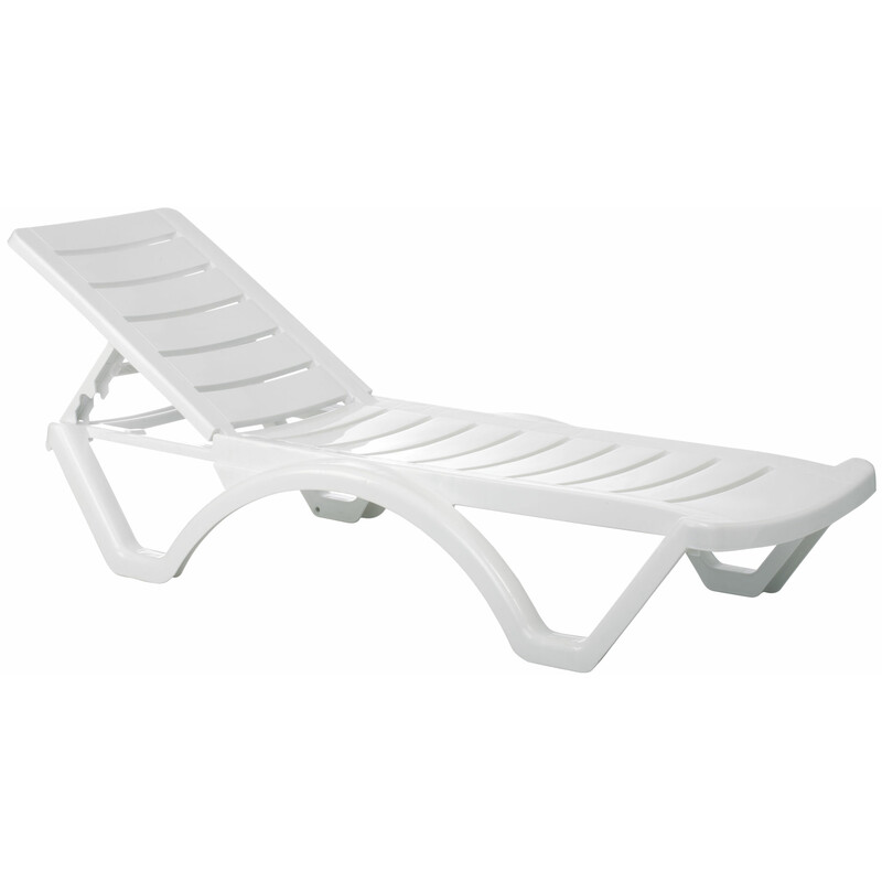 Moderne solstole med fem justerbare rygpositioner, brede ben for stabilitet, usynlige hjul, vejr- og UV‑bestandig plast, let at stable og rengøre, bærer op til 160 kg.