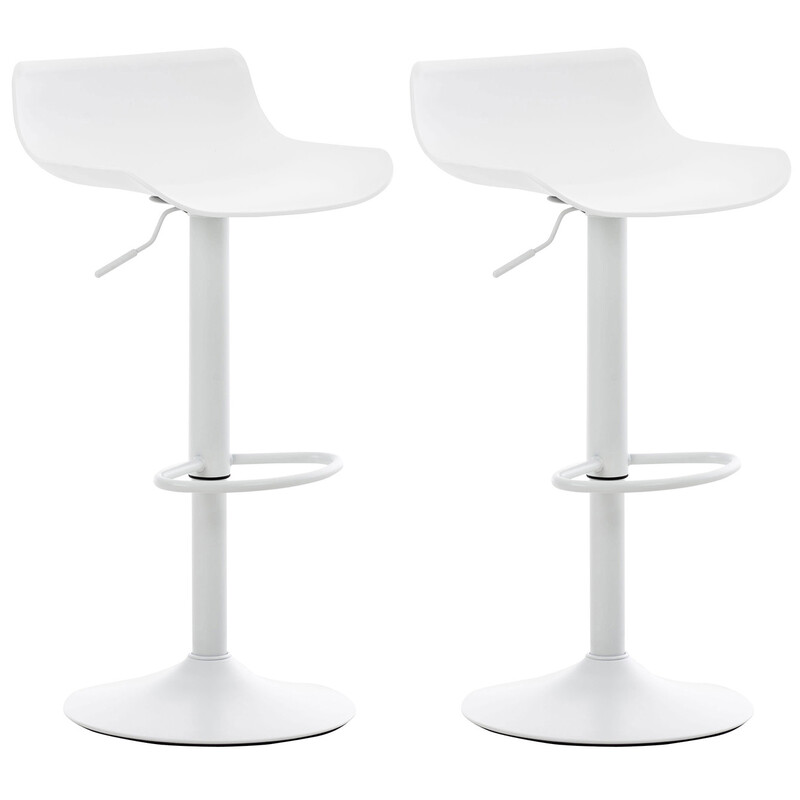 To justerbare barstole med 360° rotation, buet plastisk sæde, stabil metalramme, integreret fodstøtte, let at rengøre, maks. 136 kg, fås i hvid eller sort og komfortabel.