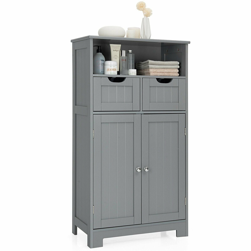 Praktisk konstruktion: Det grå skab tilbyder masser af opbevaringsplads på tre niveauer. De magnetlukkende døre i den nederste del beskytter dine genstande mod støv og fugt. Åben hylde og skuffer giver hurtig adgang til ting, du bruger ofte.