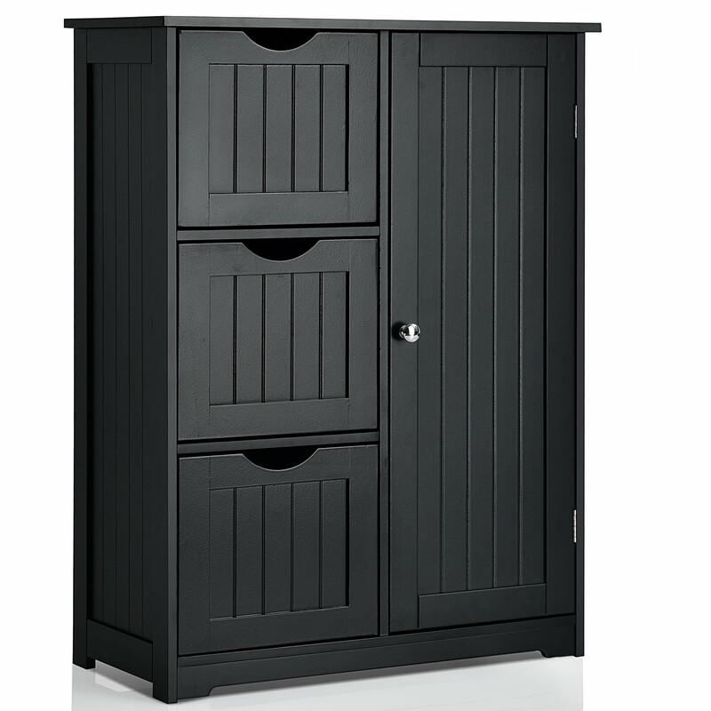 Praktisk hvid skab med tre skuffer, justerbar hylde i tre højder, vandtæt MDF, magnetlås og anti-tilt skruer, ideel til legetøj, bøger og flasker.