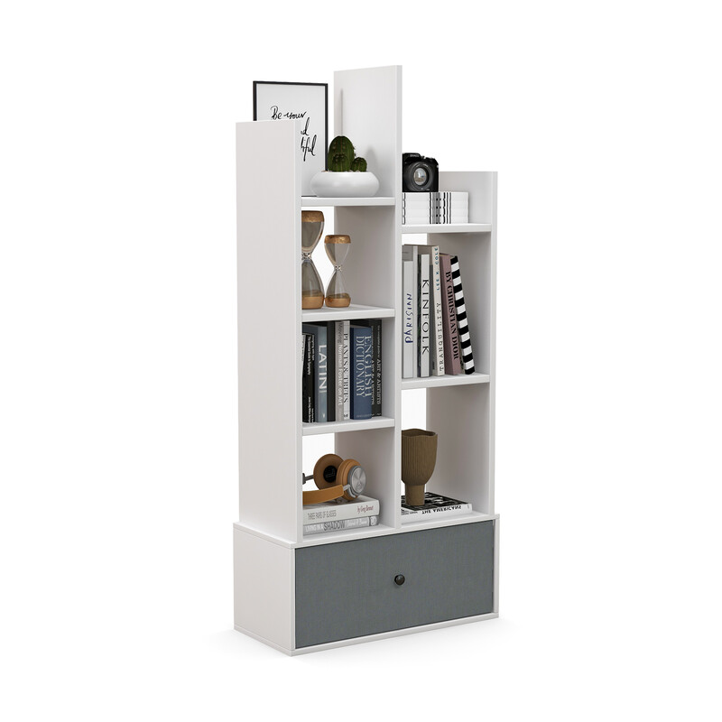 Praktisk bogreol med syv hylder og skuffe, lavet af høj kvalitetstræ. Kompakt (53x24x118 cm), bærer 15 kg pr. hylde, stabil med vægbeslag, vandafvisende, hvidt design passer i rum.