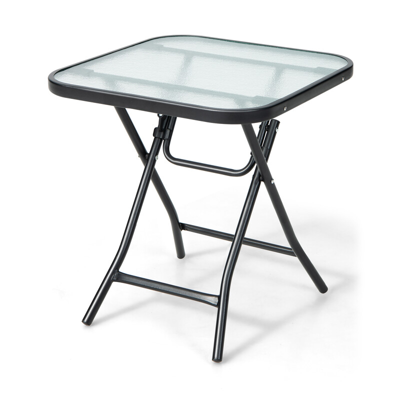 Elegant foldbart sidebord i sort stål og hærdet glas, holder op til 50 kg. Perfekt til drikkevarer indendørs eller udendørs, let at rengøre med stilfuldt design.