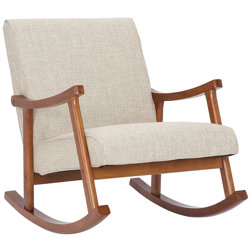 Blød polstret gyngestol i valnøddetræ med letplejet stof, komfortabelt ryglæn, bæreevne 130 kg, perfekt til afslapning i stuen eller læsehjørnet, giver ro med blid gyngebevægelse.