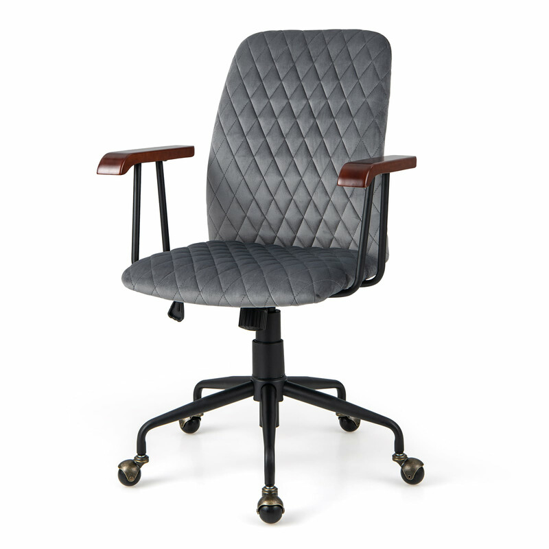 Komfortabel vintage-stol i blødt gråt fløjl med justerbart ryglæn, gummitræ armlæn, 360° drejning og antikke kobberhjul, justerbar højde, bærer op til 150 kg, holdbar til hjem eller kontor.
