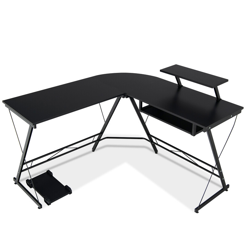 L-formet hjørneskrivebord udnytter pladsen med flytbart computerstativ, aftagelig skærmhylde, glidende tastaturhylde og robust sort konstruktion. Bæreevne 75 kg bord, 10 kg skærm, 20 kg stativ og 5 kg tastaturhylde.