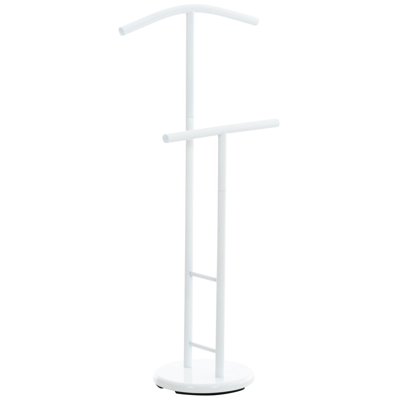 Stilfuldt tøjstativ i krommetal med træhylde bukseholder og stabil fod