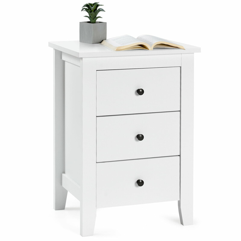 Elegant hvid natbord i holdbar MDF og spånplade med tre rummelige skuffer, stabil firebenet konstruktion, 30 kg bordpladekapacitet, passer i alle indretninger og giver god opbevaring til personlige ejendele.