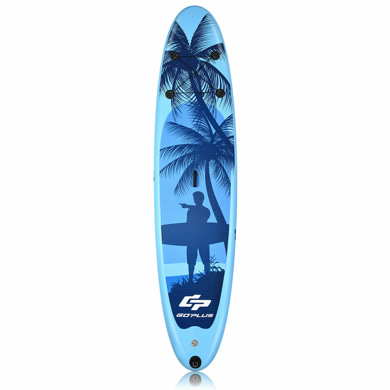 Stabil, bred SUP med glidefri overflade, justerbar flydende paddel, let at tømme og transportere i rygsæk, velegnet til surfing, fiskeri, yoga, og hurtig fremdrift med sikkerhedsline.