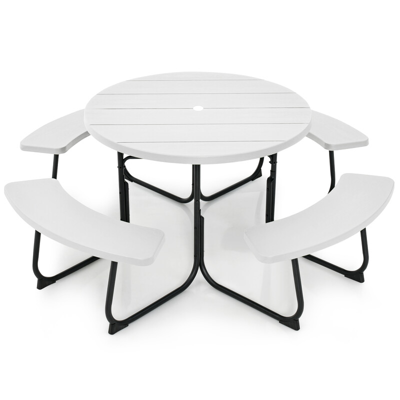 Rummeligt rundt picnicbord med fire bænke til otte personer, robust HDPE, rustfri metalram, parasolhul, vejrbestandigt, sikker, let at samle, med skridsikre ben og afrundede hjørner.
