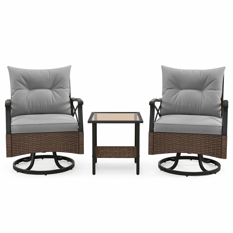 Elegant udendørsmøbel med roterende stole, bløde puder og glasbord. Holdbar PE‑rotting, 360° bevægelse, nem vedligehold, opbevaring under bordet, hver stol bærer 180 kg og bordet 50 kg.
