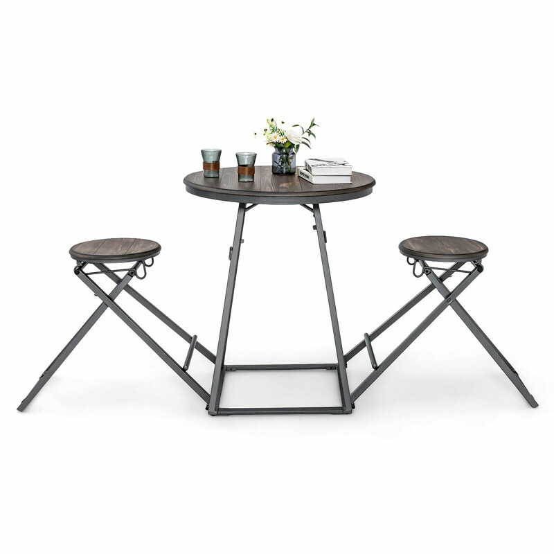 Giv dit hjem et moderne touch med dette praktiske bord- og pallset. Pallene er fastgjort til det runde bord og kan nemt foldes ind under bordet til opbevaring. Det innovative design er ikke kun stilrent, men sparer også værdifuld plads i dit hjem.