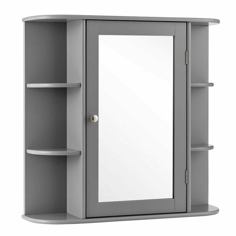 Pladsbesparende vægmonteret spejleskab i stilrent gråt med seks åbne hylder, justerbare indvendige hylder og fire niveauer opbevaring, perfekt til små badeværelser.