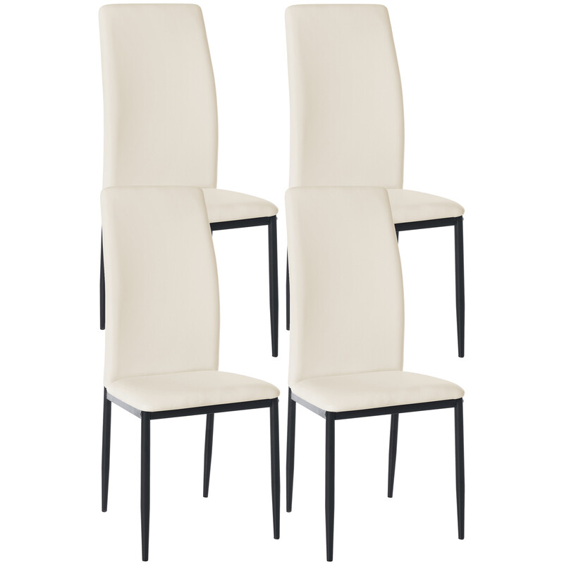 Fire spisestole med fløjl‑ eller kunstlædersæde, høj rygstøtte og stabil metalfireben. Komfortabel, let at rengøre, holder op til 100 kg, med beskyttelsesplader under benene.
