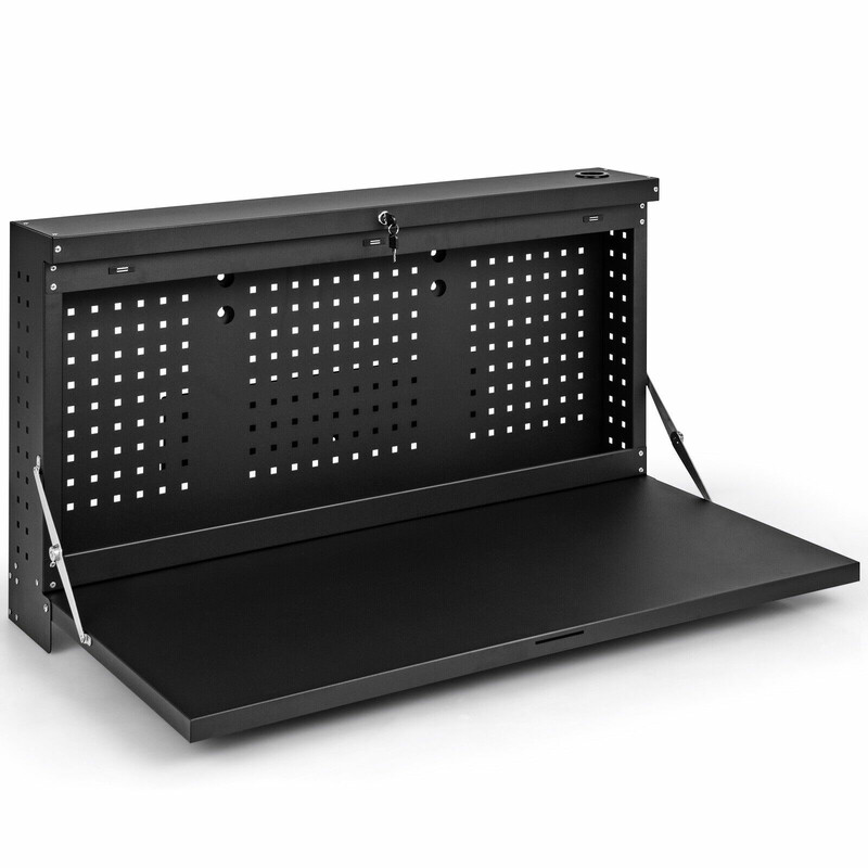 Dette vægmonterede arbejdsbord tilbyder en praktisk løsning til værktøjsopbevaring og arbejde. Værktøjstavlen og arbejdsbordet kombineres til en funktionel helhed, som sparer plads og holder værktøjerne organiseret.