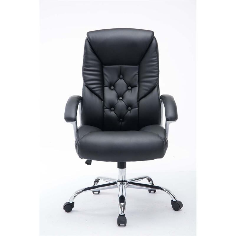 Stabil XXL kontorstol med kromramme, justerbar højde, polstrede armlæn og kunstlæder, tåler op til 210 kg, ergonomisk design, svingmekanisme og fem hjul, samt dekorative knapper for ekstra.